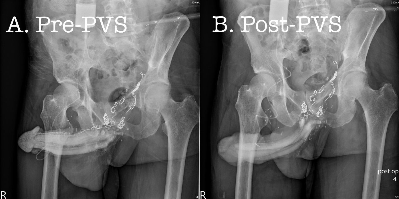 Results: In the SC group (n=5), inserted coils were scattered along the erection-related veins, including the deep dorsal veins (n=4), periprostatic plexus (n=5), iliac vein (n=5), right pulmonary artery (n=2), left pulmonary artery (n=2), and right ventricle (n=1), ended with coil migration out of the right ventricle. PVS has made some improvements in the IIEF-5 score and EHS scale. In the CC group (n=4), there was no benefit of erectile restoration after CC therapy, although no coil travelling radiographically; amazingly, however, erection restoration was unexceptionally attained from 2 weeks to two months after PVS on an ambulatory basis.