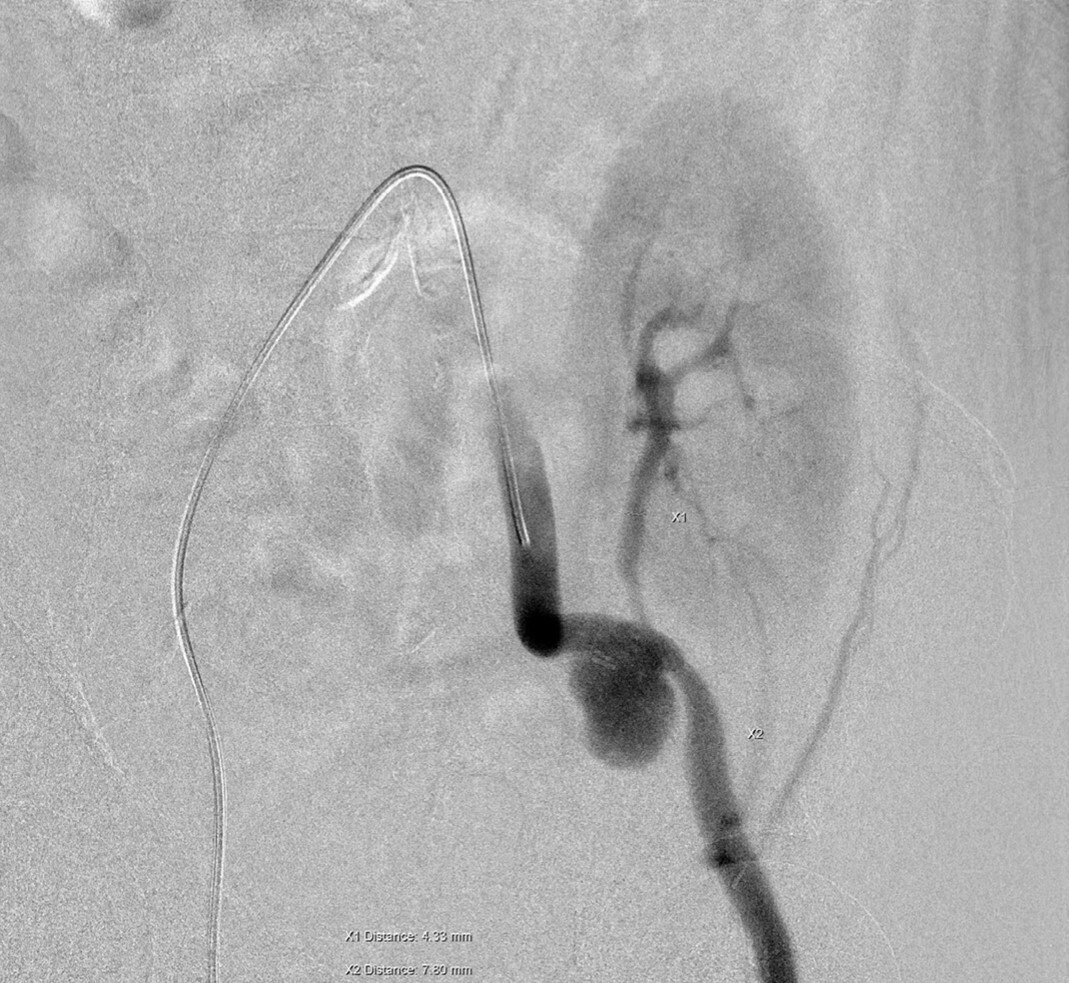 The intervention successfully isolated the pseudoaneurysm and preserved graft function. Post-procedure, the patient's serum creatinine levels improved from 4.8 mg/dL to 1.9 mg/dL at one week and stabilized at 2.3 mg/dL at the 6-month follow-up. Imaging confirmed no residual flow in the aneurysm (Figure 2), and no vascular complications were observed during the follow-up period.