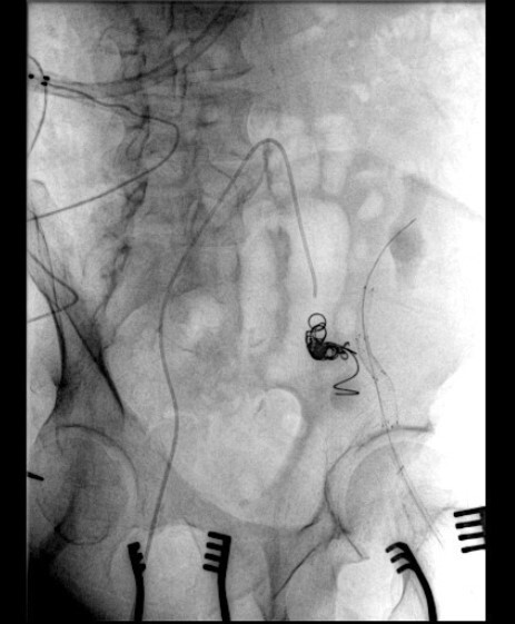 A 56-year-old male with end-stage renal disease who began hemodialysis in 2020 and underwent a cadaveric kidney transplant (right kidney to left iliac fossa) on 5 December 2023 developed a pseudoaneurysm at the anastomotic site on the left external iliac artery (EIA). This was complicated by recurrent urinary tract infection, blood stream infection, and declining renal function, with serum creatinine increasing to 4.8 mg/dL in April 2024. A duplex ultrasound identified a mass lesion, confirmed by angiography (Figure 1) as a pseudoaneurysm at the EIA anastomosis. A hybrid strategy was implemented, combining a femoral–femoral bypass using an 8 mm Geotex polytetrafluoroethylene (PTFE) graft. This was followed by percutaneous transluminal angioplasty with stenting of the graft renal artery and the EIA using covered 6.0 × 50 mm and 8.0 × 50 mm Viabahn stents to exclude inflow to the pseudoaneurysm. Finally, coil embolization of the left pseudoaneurysm and left common iliac artery was performed.