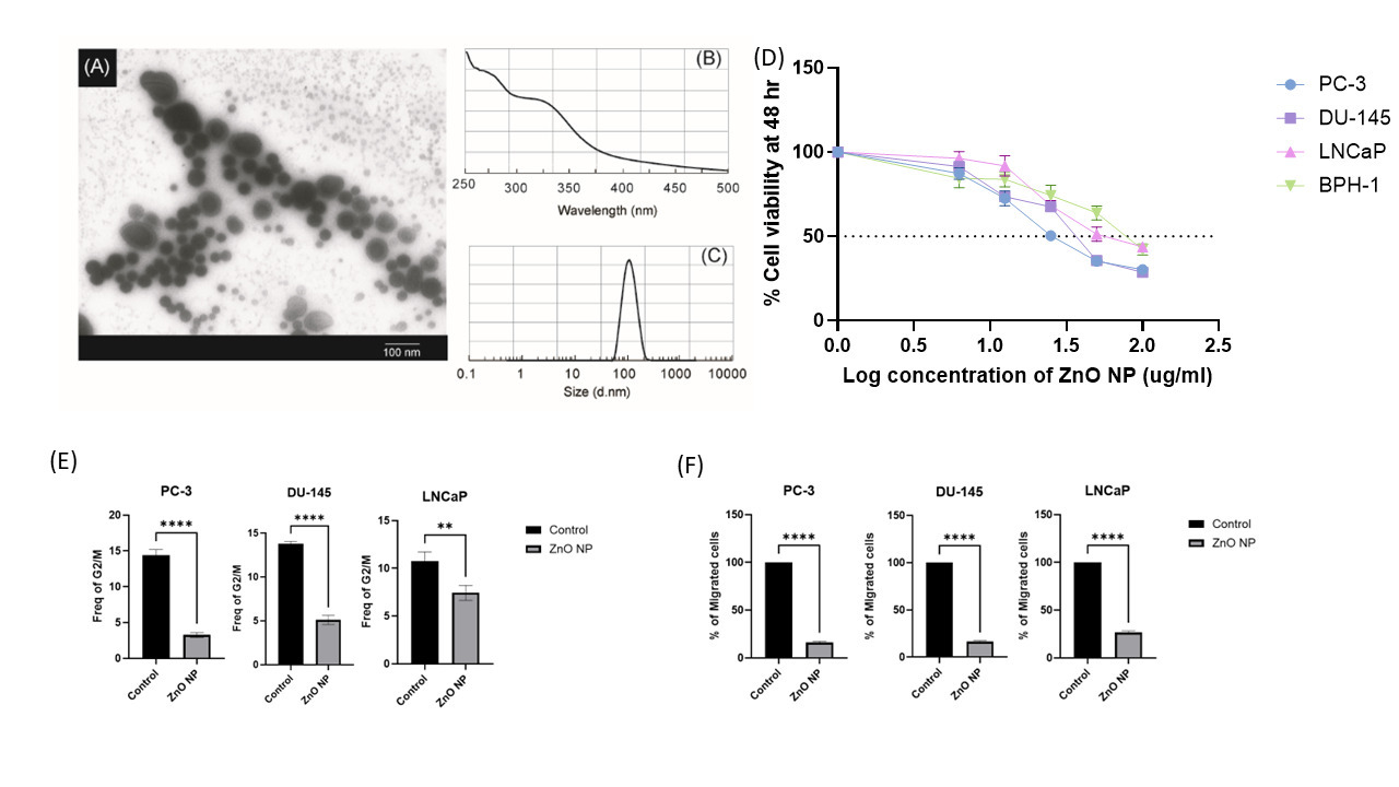 TEM unveiled the structure and characterization of successful ZnO NPs synthesis with size of 53 ± 12 nm (Figure 1A). The UV-Vis result revealed the formation of the nanoparticle (Figure 1B). The hydrodynamic diameter of ZnO NPs is 109 ± 26 nm with Zeta potential of -0.4 ± 0.1 mV (Figure 1C). ZnO NPs showed optimum in vitro stability in biologically relevant solutions. We observed a significant suppression of the cell growth in all of the four cell lines at 48 hrs (Figure 1D). The results from migration and cell cycle analysis furtherly confirmed that this suppression effect was more significant in androgen-resistant cell lines (p < 0.05) (Figure 1E and 1F). The ZnO NPs displayed cytotoxicity effects against cancer cells.