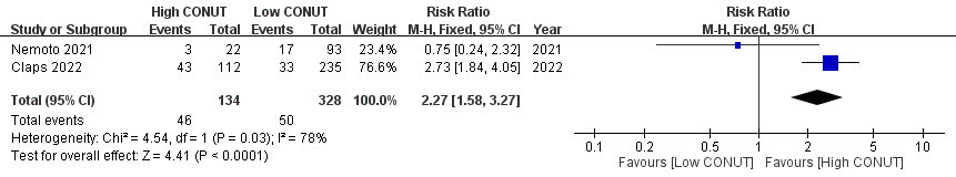A total of 462 patients were included across the two selected studies. Meta-analysis was performed using Review Manager software (version 5.4). The results demonstrated that patients with higher CONUT scores had a significantly increased risk of developing high-grade postoperative complications compared to those with lower scores. The calculated risk ratio (RR) was 2.27 (95% confidence interval: 1.58–3.27, p < 0.01, I² = 78%).